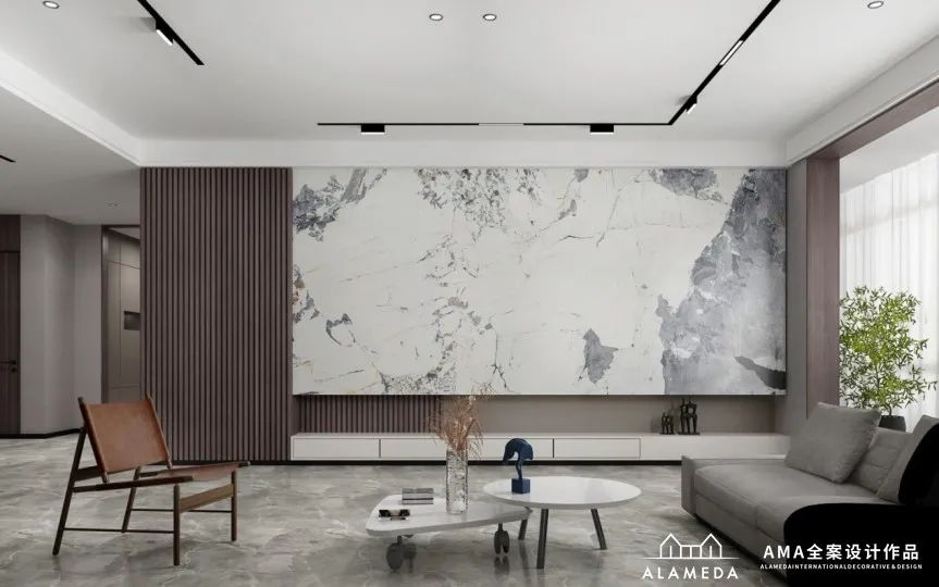 客厅以灰色调作为打底,褪去浮华的装饰,构成一个平静和谐的画面,透过线与面的结构关系,塑造纯粹的品味空间。电视背景墙大面积自然纹路大理石搭配合理比例的木线条,起到缓冲、协调室内各要素的作用。