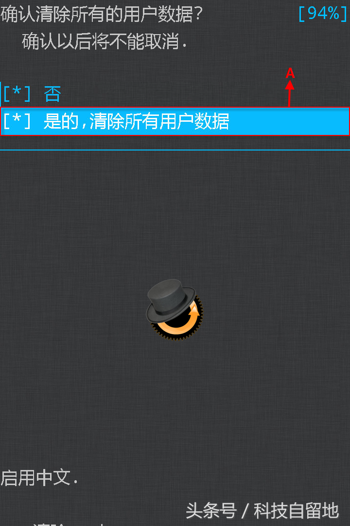 第三步:在显示屏上向下拖动,以选定“清除数据/修复系统恢复”选择项(如图所示5,A处),随后在显示屏上往左拖动。