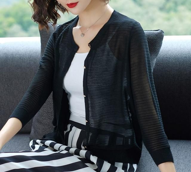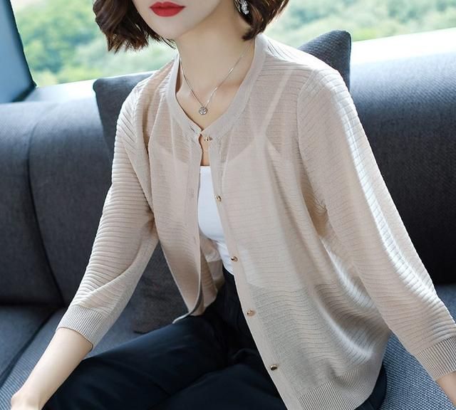春季圆领冰麻开衫纯色条纹排扣九分袖针织